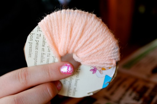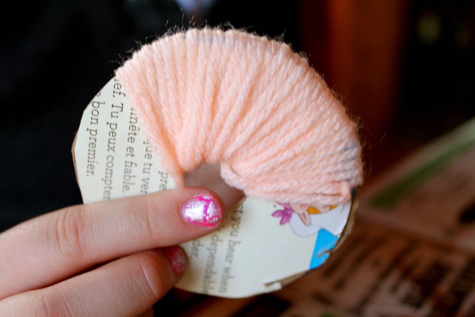 Once the template is about three quarters of the way covered in yarn you cut through the edge and tie another length of yarn around it to secure it. Click here for a video demonstration that I found on youtube if you’d like to make your own.