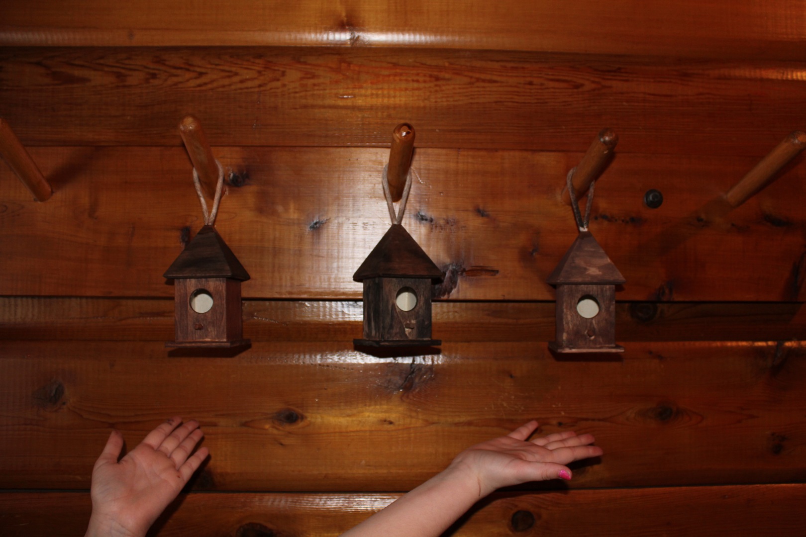 We began this project with these tiny little wooden birdhouses that I found at Michael’s craft store for $1.50 each, a few months ago. As they were very pale we decided to do a paint ‘wash’ by simply painting them with watered-down watercolor paint and also dipping the bright string in the dirty water so that the entire house would look old and weathered.