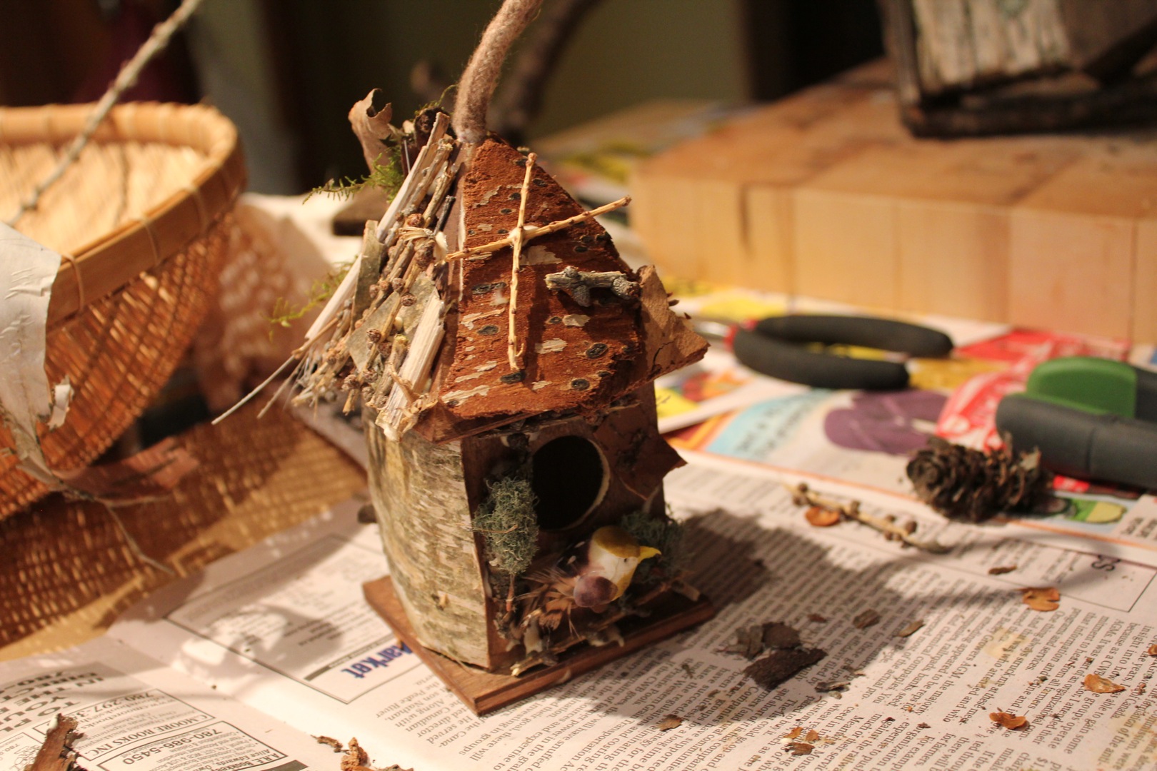A few weeks later, E and I went out into the woods with baskets and gloves and gathered twigs, pine cones, bark, moss, lichen, leaves, dried flowers and large sticks. We put the baskets in the craft room to dry out for the next few weeks until their next visit.