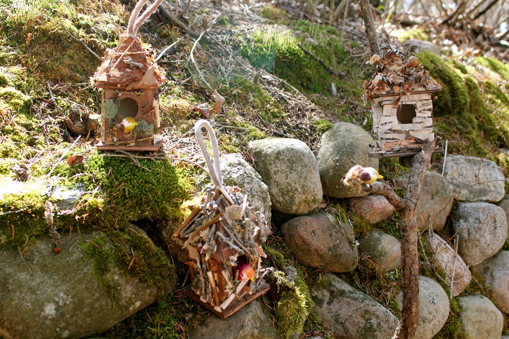bark, birdhouses, crafts with kids, decorating birdhouses, garden craft, lichen, moss, tiny birdhouses, twigs, wood craft, wood glue
