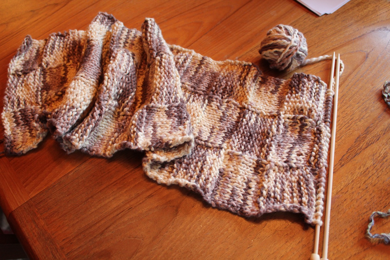 My grandmother patiently taught me to knit when I was 10 years old. I never finished that first project and after my grandmother passed on two years later there was no one else in my life that knitted. Years later, I tried crocheting and did manage to finish one afghan while living up in Inuvik, NT. I loved the hours of sitting quietly, with yarn and needle hook in hand and my thoughts free to wander… Just a few months ago, I become inspired by a few friends to begin knitting once more. I was impressed at how my hands remembered the stitches even after all of these years. Pictured below is a scarf that I knitted last month with organic cotton yarn. I haven’t cast off yet (or added fringe to the ends) as I am trying to decide if I will finish it (and either wear it or give it away) or if I will unravel it and make something new.