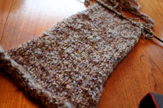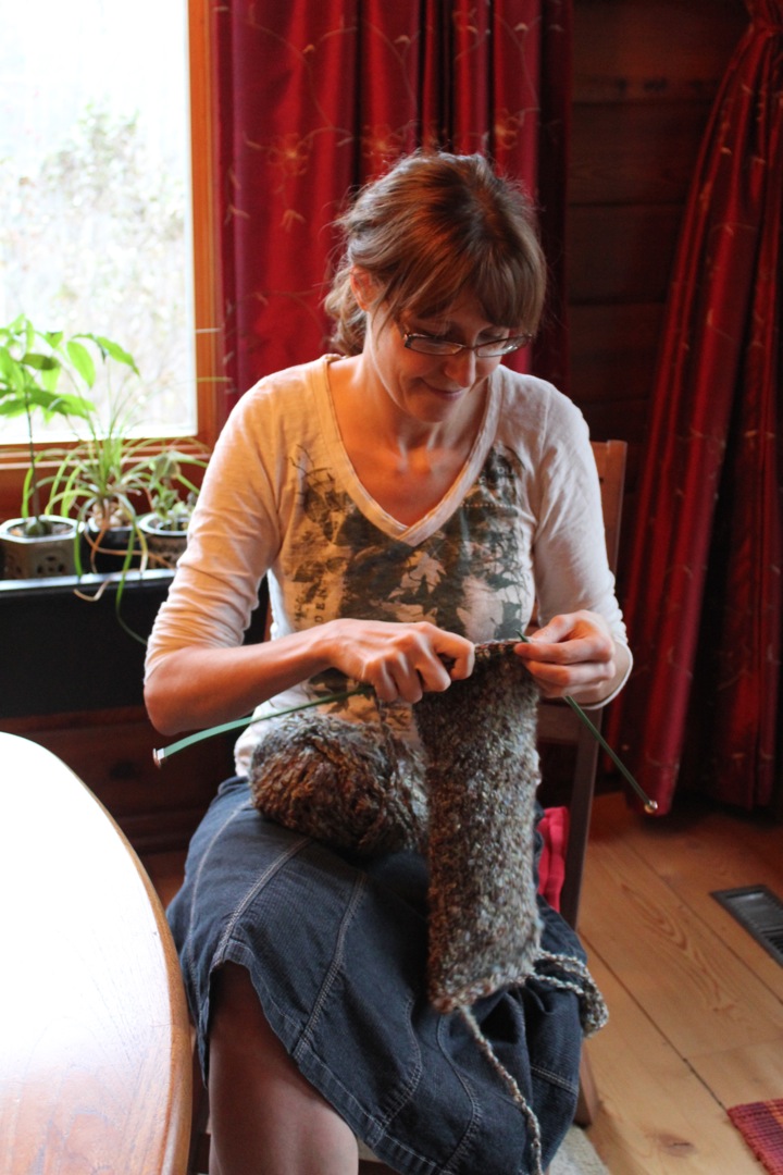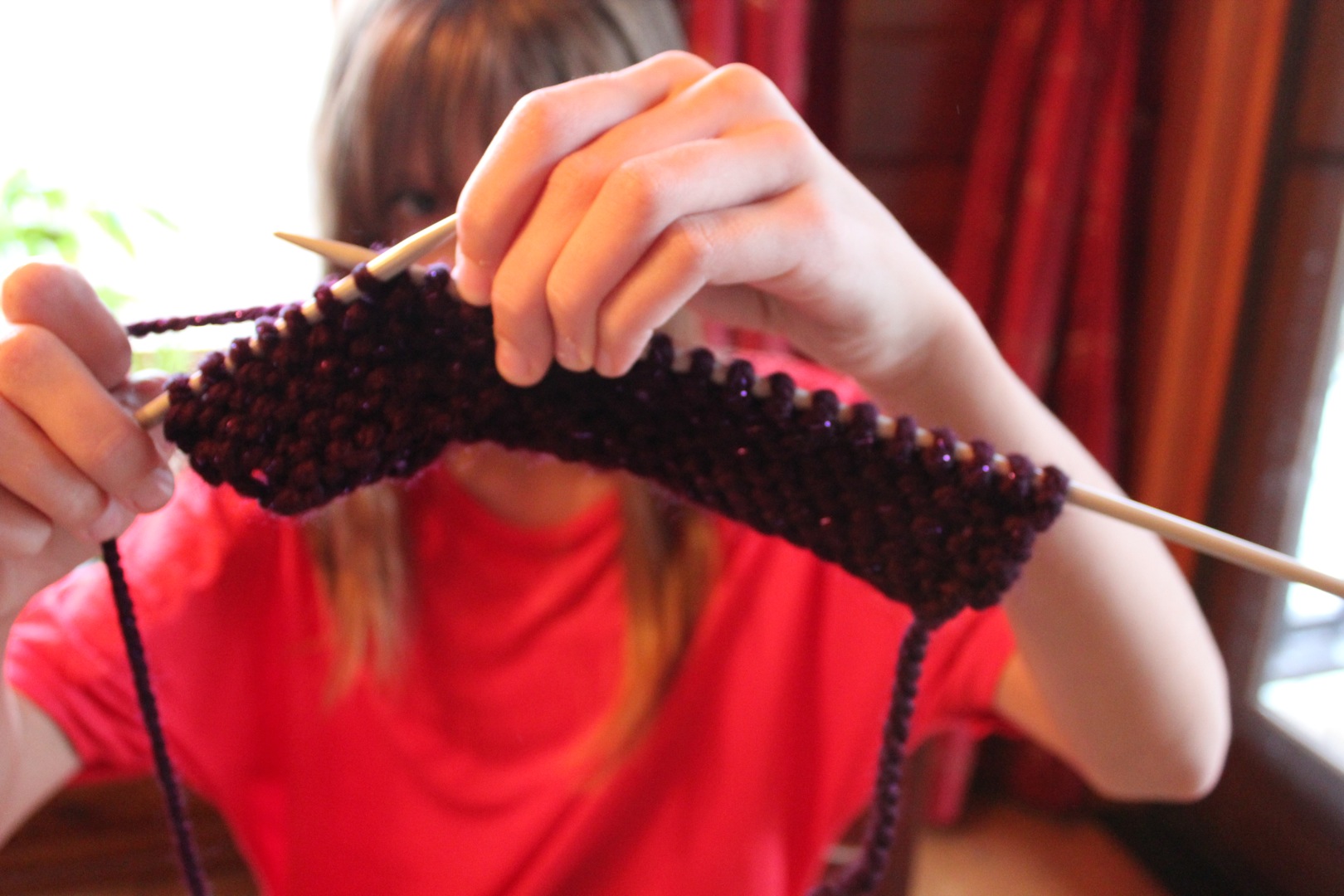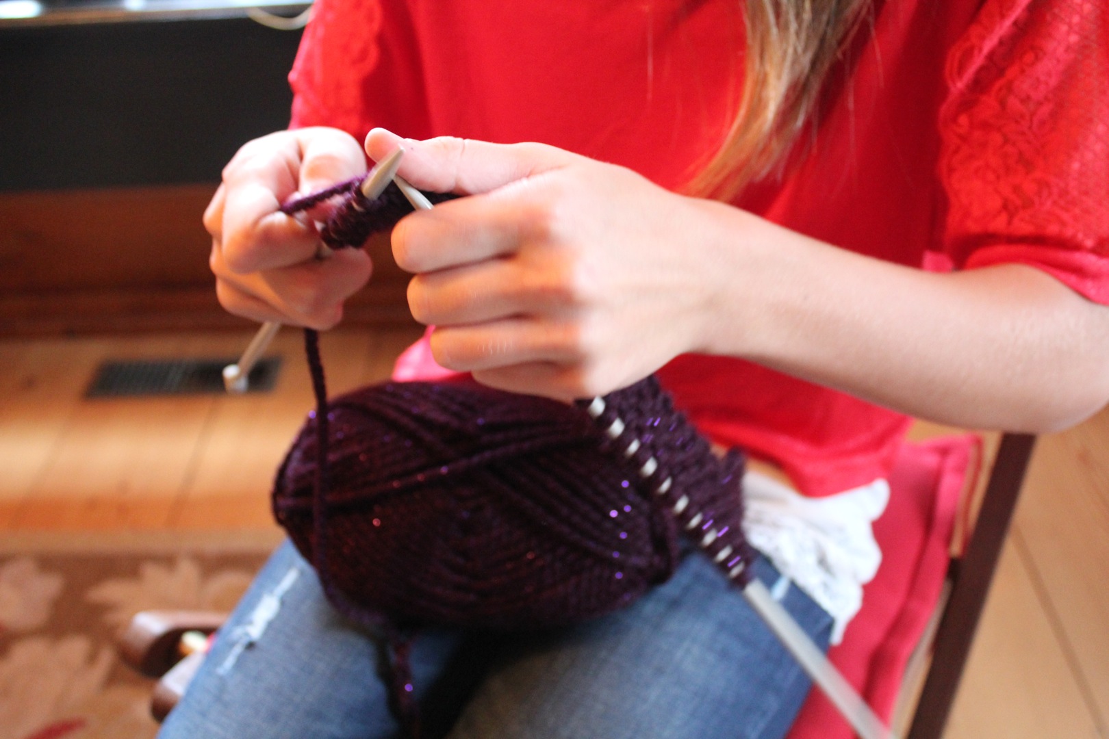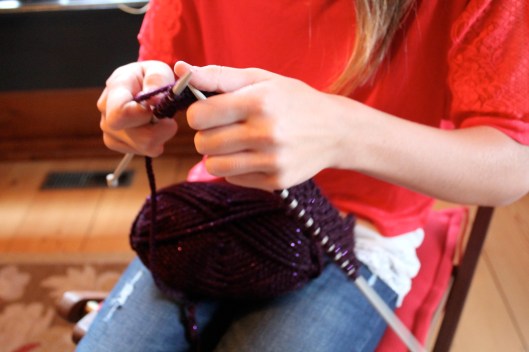 Knitting is equally enjoyable with a friend or group of friends. Yesterday, E came over to the cabin and we knitted by the fire for a few hours while catching up on each other’s busy lives. She is also a beginner knitter and we are learning together. She is working on a scarf for herself and chose a funky deep purple yarn with sparkles woven in, which perfectly matches her winter jacket. We had a good laugh about her school friend’s comments about E taking an “early retirement” with her grandmotherly hobby (she is 11 years old). But soon we will show them how “cool” knitting is, especially when we are able to wear our new creations.