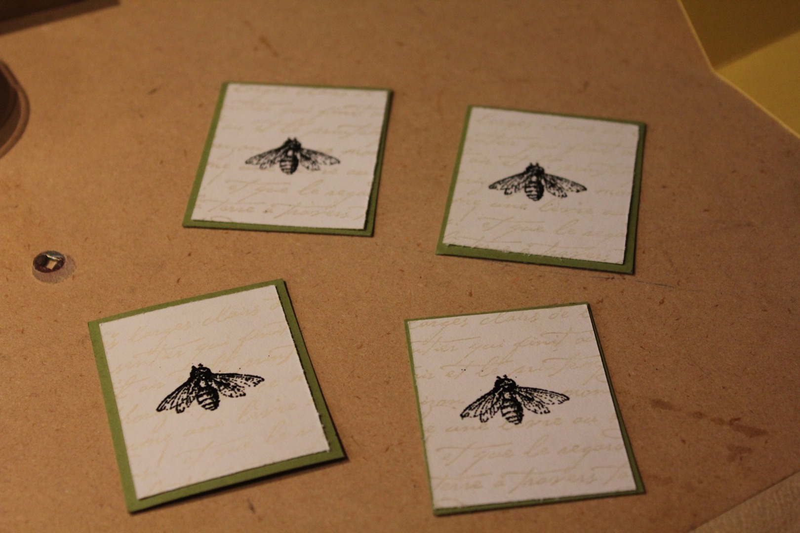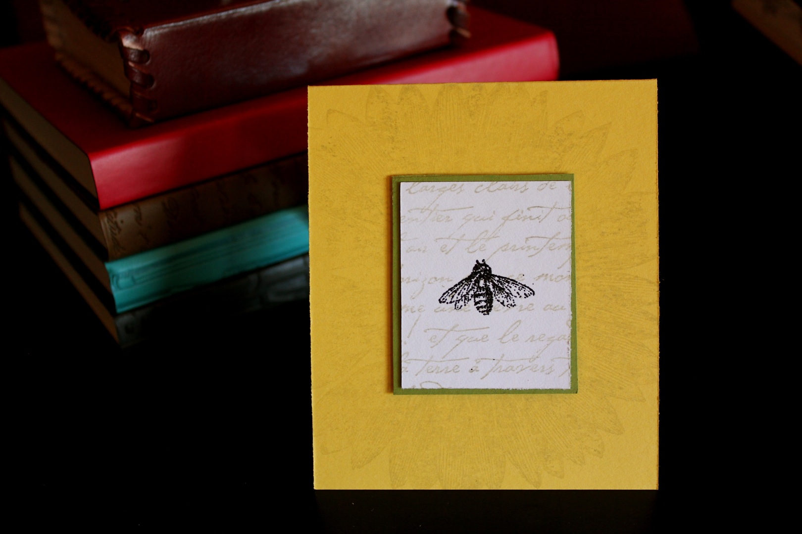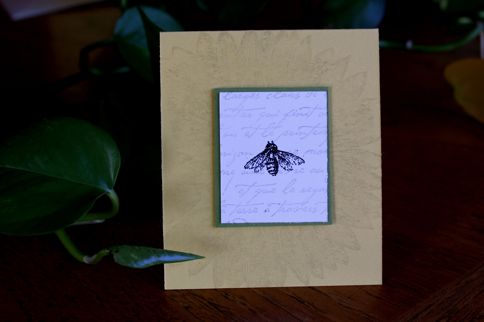 Next, I stamped small squares of white paper (I just eye-balled the size) with Stampin’ Up’s huge French Script stamp in a pale green dye ink. Then stamped the bee over this in black pigment ink. I embossed this with black embossing powder to make it shiny and stand out. Then I backed the white square with green card stock to provide a border and adhered this to the card using thick mounting tape.
