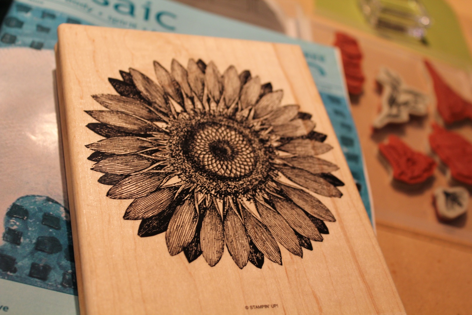 I started with the yellow card, and stamped it with this huge sunflower stamp using an ink that was just slightly darker than the card for a ‘barely there’ effect.