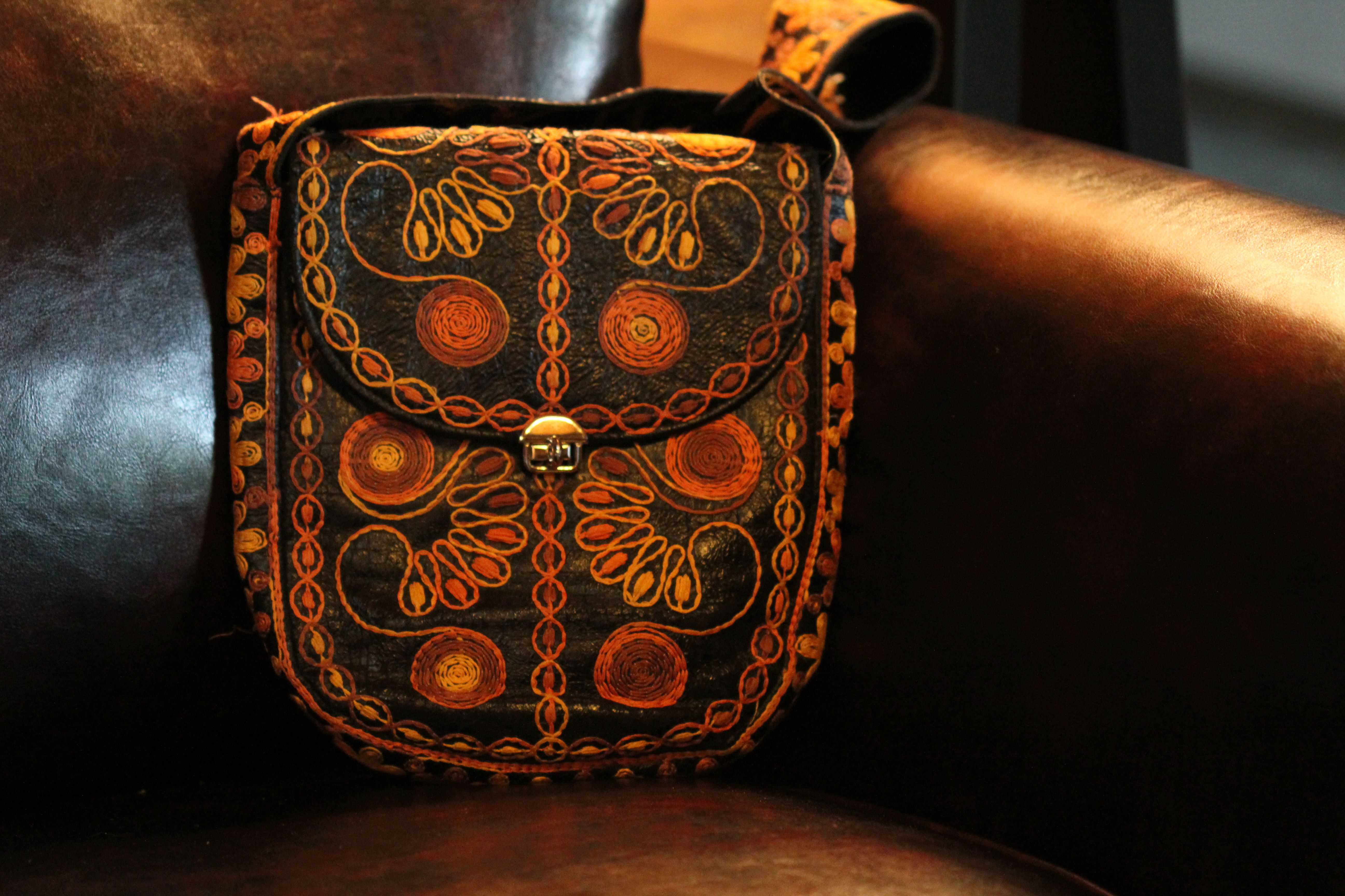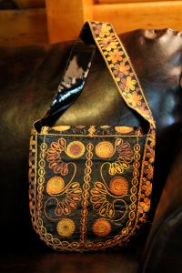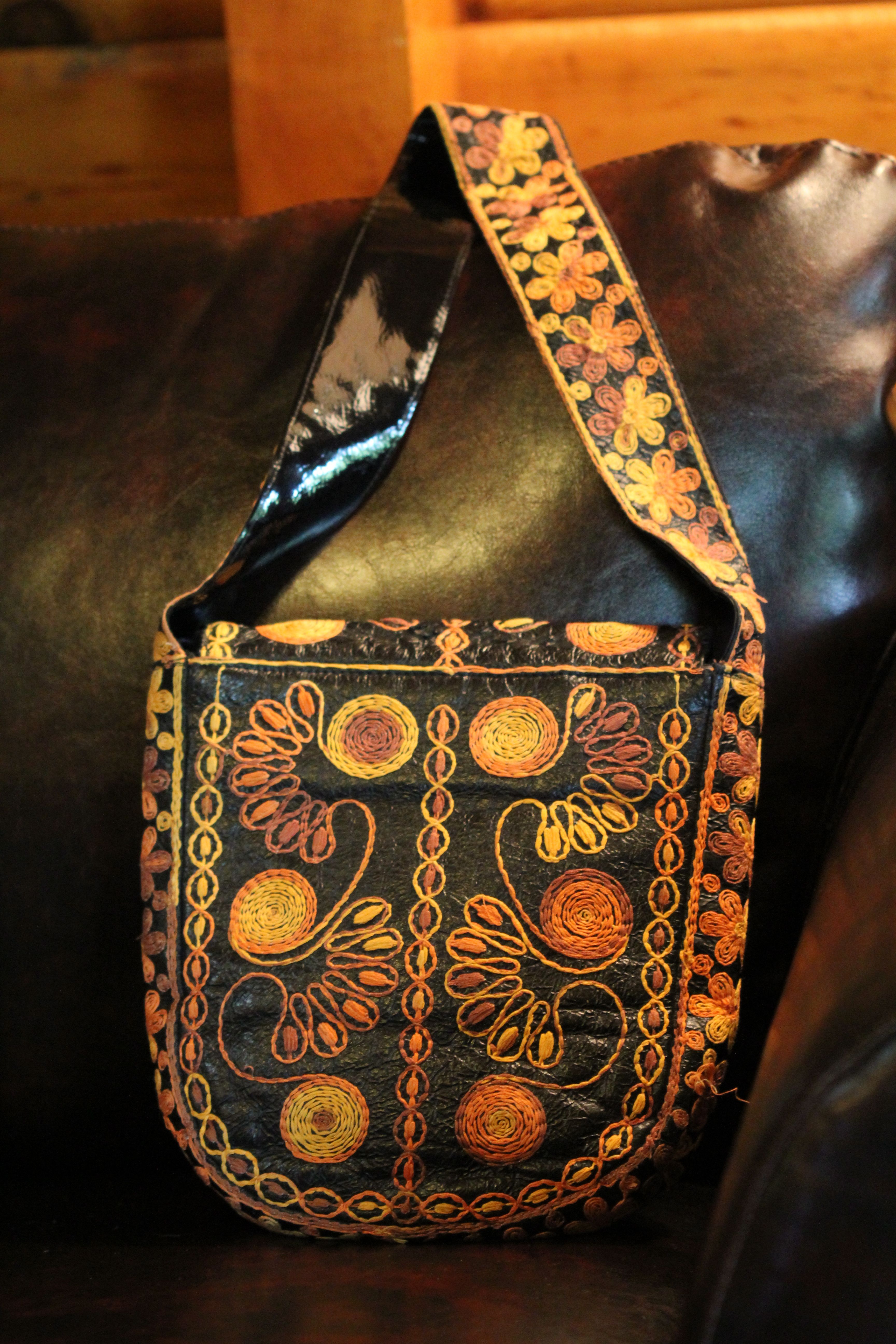 One of my own magical thrift store finds was an eclectic antique teacup and saucer covered in burgundy flowers with blue centers. I just loved the unique shape of the cup. It was very masculine in its design and looked like it belonged in a dark, cozy library. I could almost smell the leather and hint of cigar smoke whenever I used it. Sadly, I lost it in a move and am currently looking for more pieces of this china. I have also bought countless good books (I have hundreds of them) in new condition. Last fall, I found a brand new suede winter coat ($15.00) that looks exactly like the one Cameron Diaz wore in The Holiday (now I just need the tall leather boots to match and I won’t pay over $10). Lately, I have been wearing new and comfy brand-name flannel shirts ($2.99 each) while berry-picking or working out in the yard.  And just yesterday, while in the city, I found this ‘gypsy’ purse ($6.99). It is brand new and exactly what I was looking for. It was the inspiration for this post promoting second-hand shopping.
