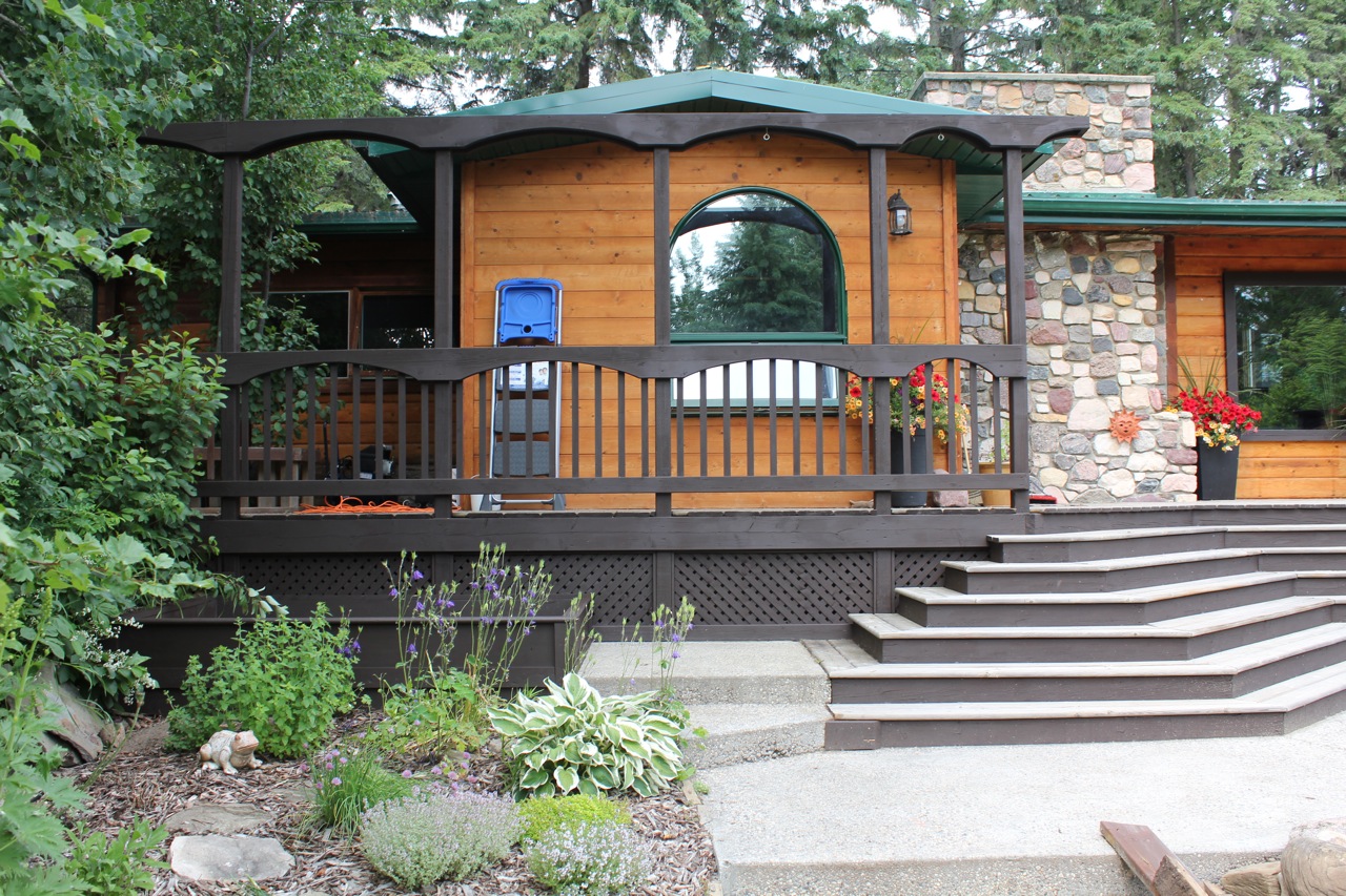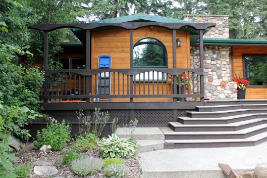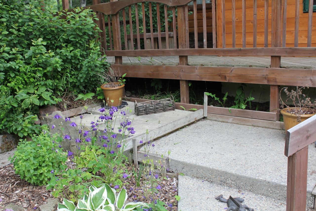 Here is another angle. The dark stain on the deck rails is a really nice contrast to the wood grain of the cabin. Instead of blending in it pops right out and frames the view quite nicely. Next year, I’d like to add a few large bright red clay pots in a variety of sizes to the concrete area for a splash of color.