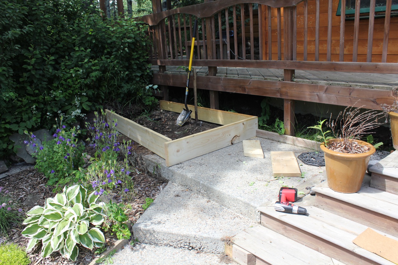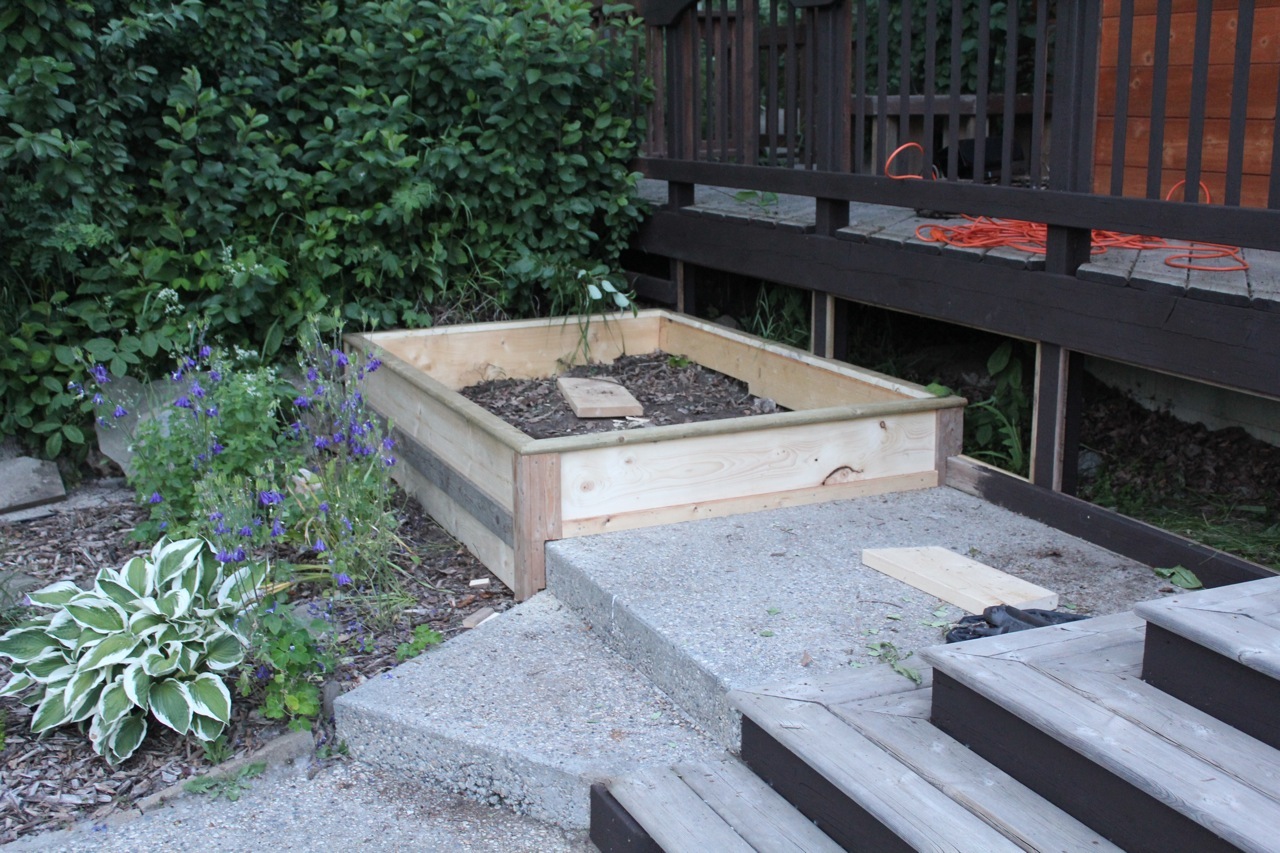 B leveled the soil and then built this beautiful planter box mainly out of scraps and repurposed wood from the shed.