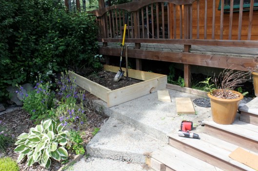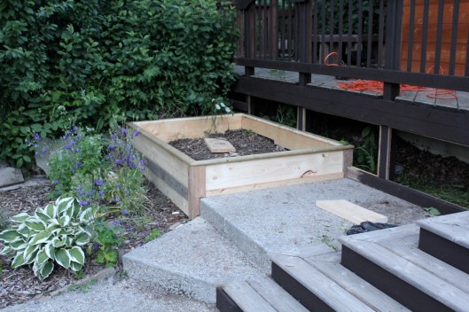 This past summer as I was making my way around the huge deck with my paintbrush and can of stain, B asked me what I was planning on doing with this big, empty, unproductive space? I told him that I’d eventually like to build a planter box there for mint. While I continued staining, he instantly began working on it…