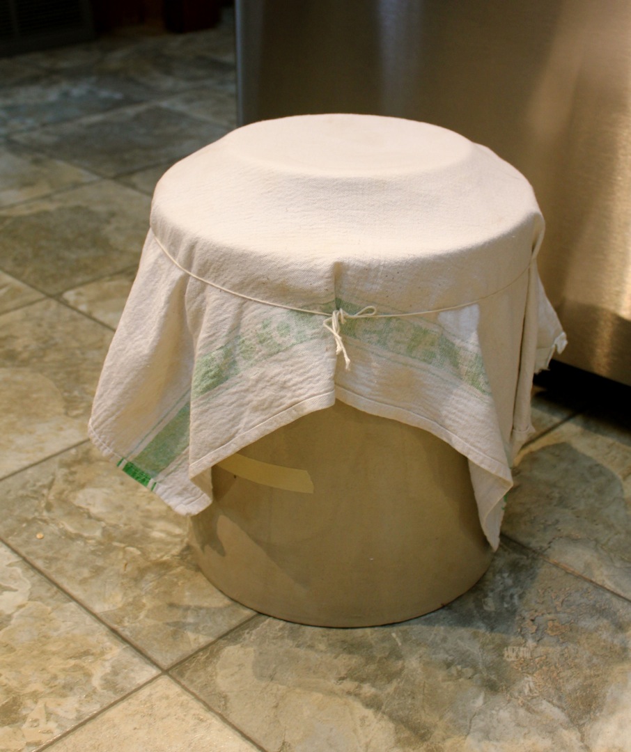 Place a plate over the cabbage making sure that the plate is fully submerged under the juice. Weigh the plate down with something clean and heavy. Cover the crock with a clean, dry cloth to keep insects and dust out. The juice and cabbage will rise a bit as fermentation begins so be sure and leave ‘room to grow’.