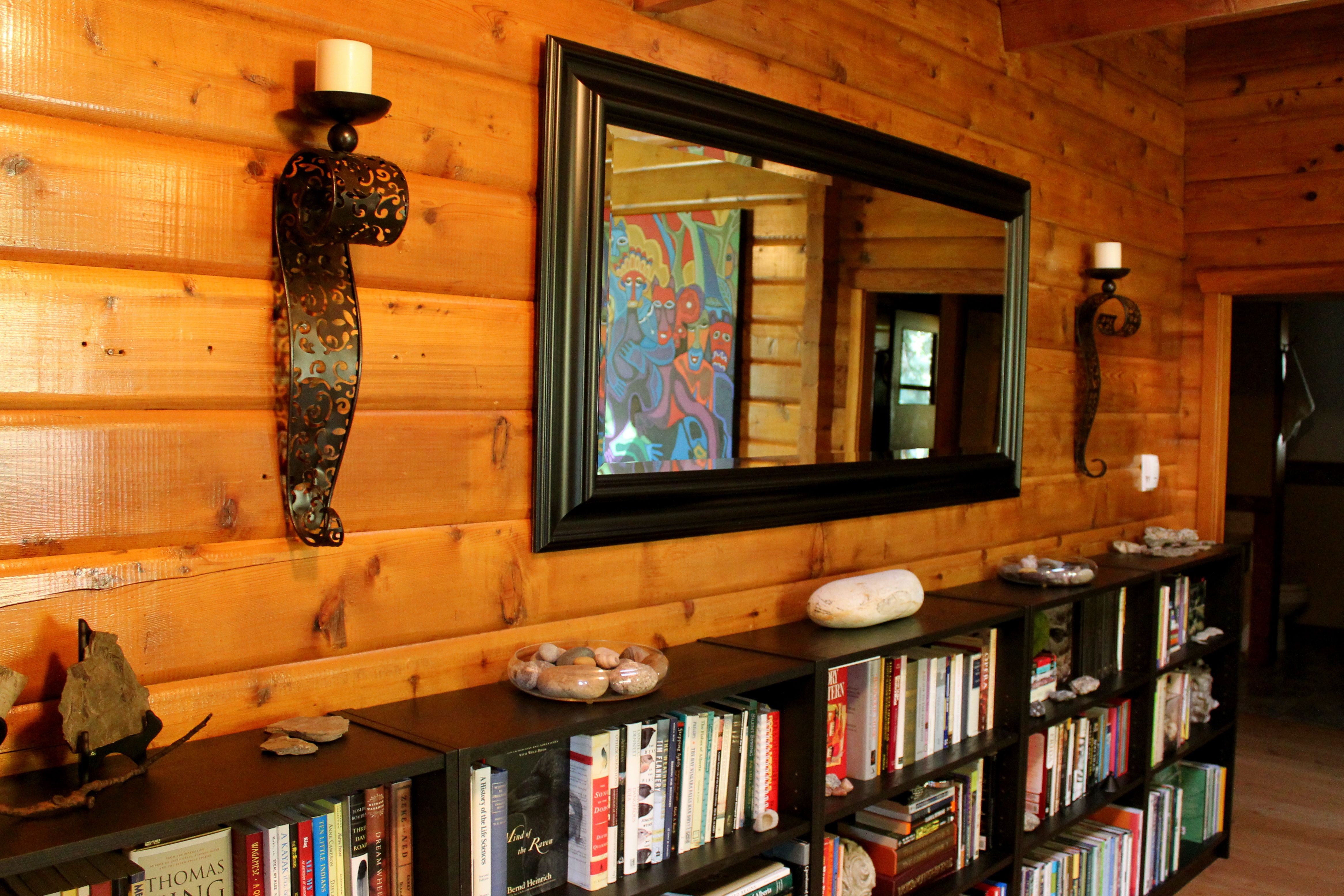 As you can see from the photos, I addressed the problem of the dark interior in three ways: First, I used large mirrors throughout the cabin to reflect incoming light back into the room. I choose a mirror with a heavy dark frame for contrast so that it would clearly stand out. Here in the living room, the mirror is directly under one of three skylights.