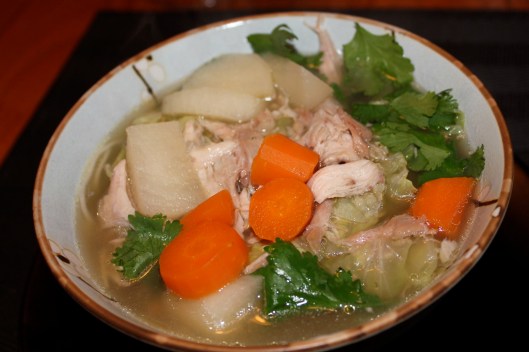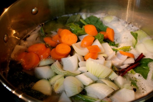 I prefer to make my own flavorful stocks (broths) using organic ingredients and freeze them for soups and sauces. This recipe is one of my favorites, found in a Martha Stewart Living magazine over 16 years ago. This particular stock is particularly good for Asia soups. Just add your favorite Asian noodles and vegetables (cook the noodles separately). I like to add fried tofu, beef and fish balls (both found in your local Chinese grocery store), suey choy or bok choy and daikon. I rarely make the recipe as written. Instead, I use it as a guide and just use whatever I currently have in the fridge and pantry, or whatever happens to be fresh in the garden.