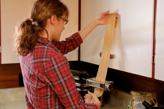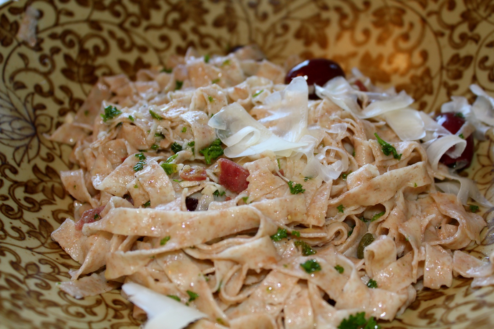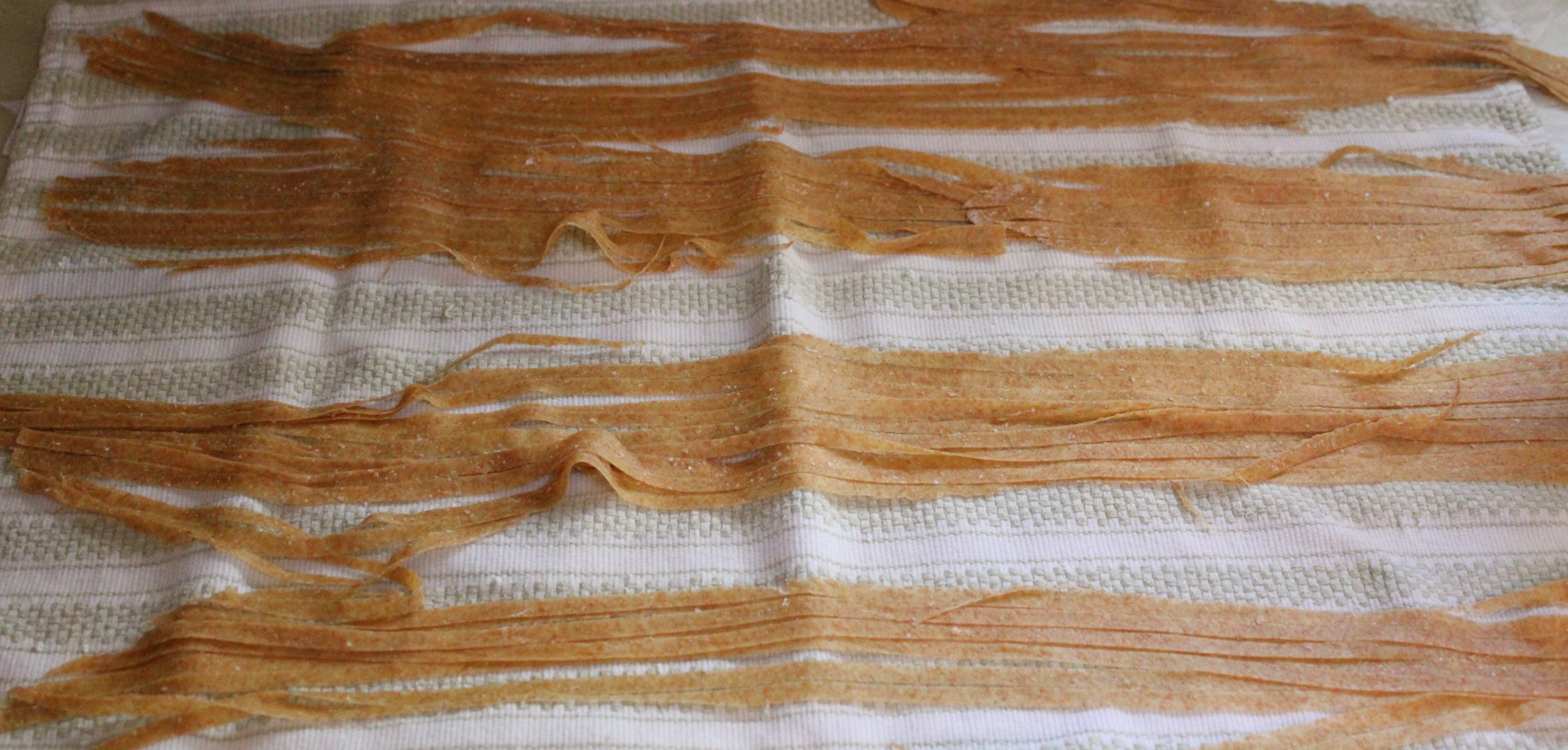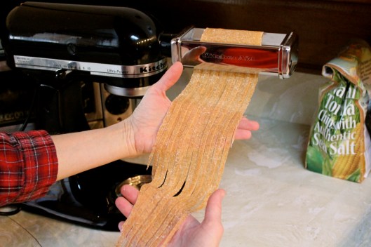 I have been making my own pasta for quite a few years now have been having a lot of fun experimenting with various recipes. Now that I am milling my own flours, my pasta will be even more fresh and flavorful. This spelt pasta was my first experiment using the spelt flour that we milled just minutes before with our WonderMill. If you’ve never tried fresh pasta (not including store-bought, which has preservatives), it is worth either making your own or taking a special trip to the farmers market to get some!